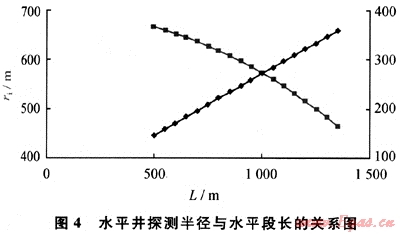 給定水平井段長(zhǎng)500~1350m,測(cè)試時(shí)間10h,其他參數(shù)同前,由式(8)得出探測(cè)半徑與水平段長(zhǎng)度的關(guān)系(圖4)。可以看出:擬圓形坑道外緣半徑隨水平段長(zhǎng)的增產(chǎn)而變大,而探測(cè)半徑是降低的。