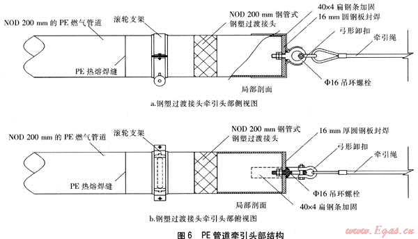 牽引頭部采用與PE管道相同規(guī)格的鋼塑過渡接頭制成,鋼塑過渡接頭的PE管端與NOD 20mm的PE管道熱熔焊接,DN 200mm鋼管端用厚度為16mm、直徑為219mm的圓形鋼蓋板滿焊封閉。鋼蓋板中心開有直徑為20mm的圓孔,事先穿入M16帶肩吊環(huán)螺栓1根(整體式鍛鋼材質(zhì)),鋼蓋板內(nèi)側(cè)用M16雙螺母緊固,吊環(huán)貼附于鋼蓋板外側(cè)。吊環(huán)圓孔內(nèi)、外徑分別為48、80mm,其底部與鋼蓋板通過焊接連為一體。吊環(huán)兩側(cè)各焊接1根規(guī)格為40×4的扁鋼條進(jìn)行加固,扁鋼條從鋼蓋板表面延伸至鋼塑過渡接頭DN 200mm鋼管端側(cè)面,所有焊縫均為滿焊。