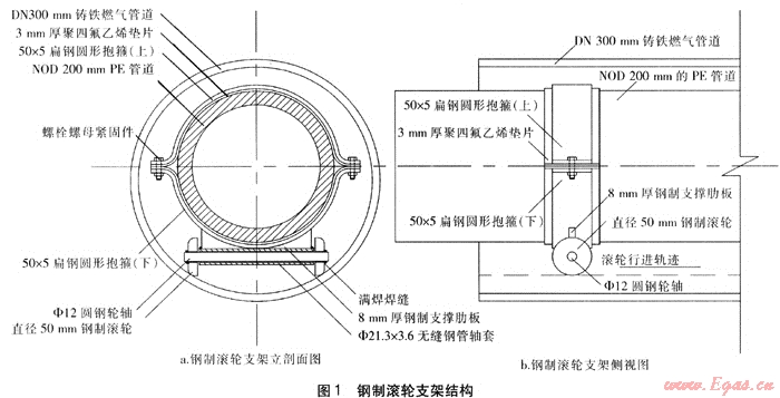 摘要:以某DN 300mm鑄鐵燃?xì)夤艿栏脑旃こ虨槔?,詳?xì)介紹了以廢舊的DN 300mm鑄鐵燃?xì)夤艿罏樘坠?,將公稱外徑200mm的PE燃?xì)夤艿啦捎娩撝茲L輪支架穿插入套管的施工方法。