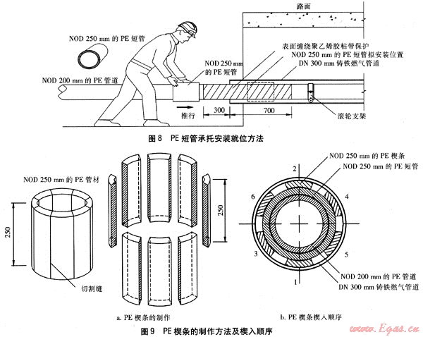 ② 如圖8所示,在NOD 200mm的PE管道上套入一截長度為300mm的NOD 250mm的PE短管(PE80、SDR11),并將其置于套管內(nèi);由于NOD 250mm的PE短管的內(nèi)徑比NOD 200mm的PE燃?xì)夤艿赖耐鈴铰源?,適合用作對(duì)NOD 200mm的PE燃?xì)夤艿肋M(jìn)行限位、支承的承托。NOD 250mm的PE短管外側(cè)與套管端口的水平凈距為200mm,作為柔性防水層封堵的預(yù)留空間。