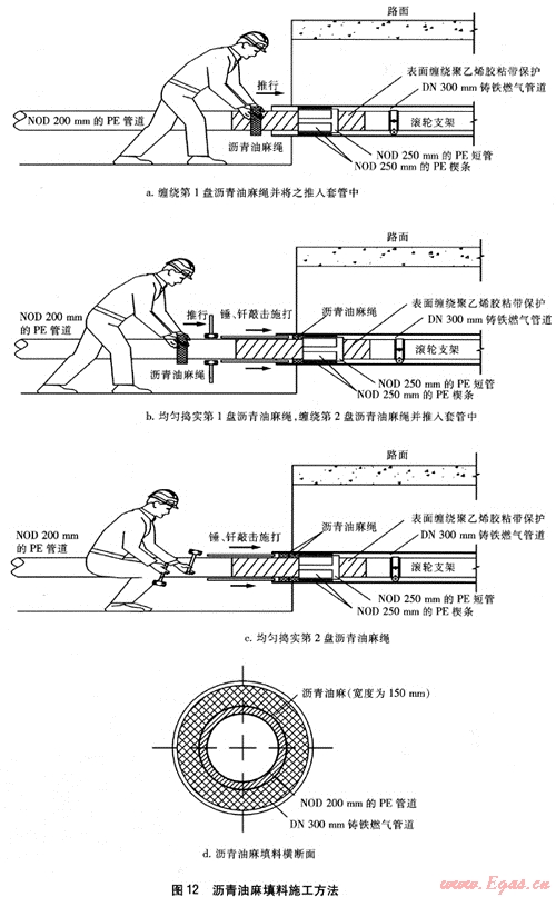 ④ 瀝青油麻填料一般分2次填塞,以確保其密實(shí)度,具體做法見圖12。將直徑為30mm的油麻繩用環(huán)氧煤瀝青漆浸泡15min后取出,均勻纏繞在NOD 200mm的PE燃?xì)夤艿郎?PE管道表面事先纏繞1層聚乙烯膠粘帶保護(hù),搭接寬度為膠粘帶寬度的50%,纏繞長度為1000mm),待形成寬度約80mm,外徑約300mm的盤狀繩圈后,將瀝青油麻繩推入套管內(nèi)的空隙內(nèi),用直徑為20mm、一端為光圓鈍頭的鋼筋釬棒均勻搗實(shí)瀝青油麻繩,并使之緊貼于NOD 250mm的PE短管承托的外側(cè)端面上。按同樣要求纏繞、搗實(shí)第2盤瀝青油麻繩,瀝青油麻填料的最終寬度為150mm。