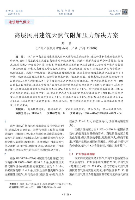 上述為廣州市高層民用建筑居民用戶天然氣供應(yīng)系統(tǒng)為例,通過計算和實地測量天然氣的壓力,驗證了高層民用建筑存在高樓層用戶超壓問題。提出4種解決方案并分析其特點、優(yōu)缺點、適用范圍。