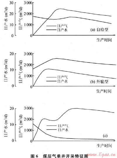 自給型:氣體從本井降壓解吸半徑之內(nèi)從本井產(chǎn)出。排采井一般處于構(gòu)造平緩部位,層內(nèi)均質(zhì)性強。日產(chǎn)氣量經(jīng)歷上升-穩(wěn)產(chǎn)-遞減3個階段;相對應(yīng)地,日產(chǎn)水量經(jīng)歷下降-平穩(wěn)-遞減3個階段(圖6)。