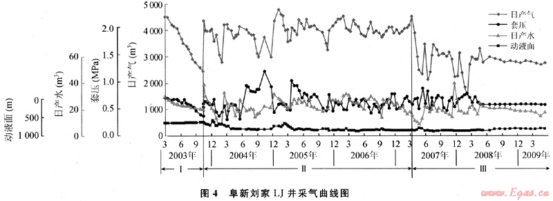 阜新劉家區(qū)塊LJ井2003年投產(chǎn)(圖4),初期日產(chǎn)氣4500m3,穩(wěn)產(chǎn)4a開始遞減,目前日產(chǎn)氣2780m3,已累計采出662×104m3,采出程度26.6%,預(yù)計采收率50%。解吸類型劃分為阻礙解吸(高液面)、暢通解吸、低飽和解吸3個階段。①阻礙型解吸:解吸速率大于降壓速率,氣泡變形,解吸困難;②暢通型解吸:解吸速率接近降壓速率,氣泡帶出部分束縛水,產(chǎn)量理想;③低飽和解吸:解吸速率小于降壓速率,應(yīng)力閉合。從中國目前煤層氣開采現(xiàn)狀分析,直井第一階段一般小于1a;第二階段井距為300m×300m一般可采4~6a,與井距、煤厚和排采速度等有關(guān);第三階段開采時間較長,羽狀水平井穩(wěn)產(chǎn)階段更短,為1~3a。