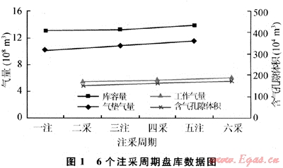 3) 由于庫內(nèi)含氣孔隙體積上升,使氣庫總體運行效率得以提高,庫容量、工作氣量和氣墊氣量都逐步提高,其中第六采氣周期末工作氣量比第二采氣周期末上升約14%。