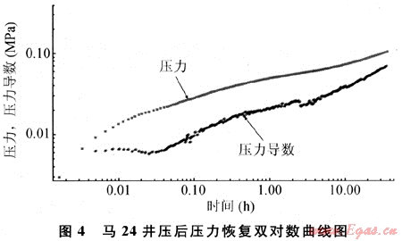 在馬24井為代表的壓后壓力雙對(duì)數(shù)曲線上,壓力與壓力導(dǎo)數(shù)成鐵軌狀,水力裂縫特征明顯,說(shuō)明壓后在地層中形成了主裂縫(圖4)。
