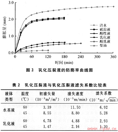 油基、泡沫和乳化壓裂液是目前對(duì)付強(qiáng)水敏地層壓裂改造的主要液體體系,因油基壓裂液在低溫下存在破膠困難和施工時(shí)的重大安全隱患,二氧化碳泡沫壓裂液要形成泡沫必須滿足一定的溫度條件,由于地層溫度低,在大部分裂縫中,壓裂液溫度小于CO2起泡溫度,不能形成泡沫,限制了它在儲(chǔ)層中的使用[2],而乳化壓裂液通過(guò)油相的乳化形成油水兩相降低濾失,同時(shí)大大減少了水相的用量,可以起到較好的防膨作用,安全隱患較油基小得多,因此選用乳化壓裂液體系作為強(qiáng)水敏地層的壓裂液體系。研究表明,油相:水相=1:1的乳化壓裂液體系防膨效率可以達(dá)到76.15%,較水基壓裂液提高50.0%,濾失系數(shù)降低60.0%~70.0%(見圖2、表2)。