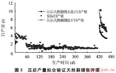 由圖4可知,一旦微裂縫張開,壓后累積產(chǎn)量就增加明顯,而且累積產(chǎn)量隨裂縫張開面積的增加而極為明顯地增加,產(chǎn)量與微裂縫張開面積密切相關(guān),因此有必要提高施工砂液比,甚至采取縫內(nèi)暫堵技術(shù)來大幅度的提高縫內(nèi)凈壓力,盡可能使更多天然微裂縫張開,這是該油氣田高砂液比和縫內(nèi)暫堵壓裂取得好的效果的原因,相信也是開發(fā)這類低滲透油氣田的關(guān)鍵所在。