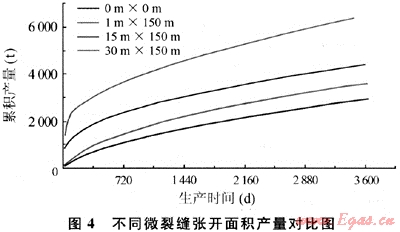 采用相同的輸入?yún)?shù),微裂縫張開面積分別假設(shè)為0m2、150m2(1m×150m,天然微裂縫張開范圍為裂縫長度方向150m,垂直裂縫方向1m,以下同),2250m2(15m×150m),4500m2(30m×150m),裂縫孔隙度為0.12%,微裂縫滲透率為800μm2。圖4給出了不同微裂縫張開面積下的累積產(chǎn)量隨時間的變化曲線。