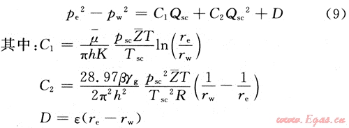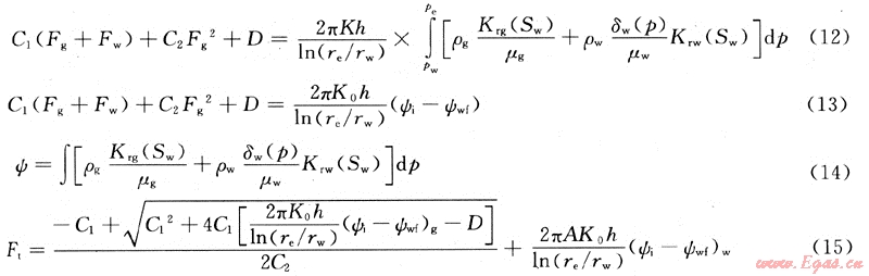 假設一口氣水兩相流氣井位于均質(zhì)、水平等厚的無限大地層中,儲層中發(fā)生氣、水兩相等溫滲流,符合非線性滲流方程式(5)、式(6),氣、水彼此互不相溶,忽略重力及毛細管力的影響。當?shù)蜐B透多孔介質(zhì)中的流體遵循非線性滲流方程式(5)、(6)時,氣體在低滲透多孔介質(zhì)中遵循二項式運動規(guī)律,即式(1),相應的產(chǎn)能方程可寫為[7]: