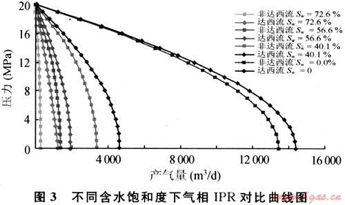 計算結(jié)果表明(圖3):低滲透砂巖儲層隨含水飽和度增加,氣井產(chǎn)能降低嚴重。當含水飽和度為40%時,氣井無阻流量的損失幅度約為干氣藏的70%,含水飽和度達到60%時,氣井無阻流量的損失幅度約為干氣藏的90%??紤]低滲透介質(zhì)非達西滲流特征的氣體IPR曲線相對線性達西滲流特征的氣體IPR曲線小幅收縮,隨含水飽和度增加,由非線性滲流引起的產(chǎn)能損失逐漸減少。當生產(chǎn)壓差較小時,二者計算的氣井產(chǎn)量基本相同。