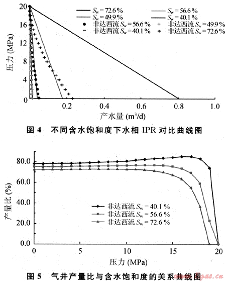 圖4表明該低滲透氣藏氣井產(chǎn)水量非常少,幾乎不產(chǎn)水,含水飽和度高的情況下產(chǎn)水量相對增加;在考慮非線性滲流因素影響后,隨氣井產(chǎn)量的降低,產(chǎn)水量進一步下降。在無人工改造的情況下,由于低滲透儲層中水滲流界面阻力梯度較大,導致大量水被束縛在孔隙、吼道中,難以動用,一方面減小了氣體的滲流通道,另一方面對氣體形成水鎖圈閉,從而大大增加了氣體開發(fā)的難度,降低了氣井產(chǎn)量。