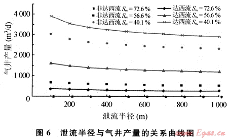 當井底流動壓力為10MPa、即生產(chǎn)壓差為10MPa時,在同樣的泄流半徑條件下,隨著低滲透儲層含水飽和度的增大,氣井產(chǎn)能逐漸減??;在同樣含水飽和度條件下,隨泄流半徑的增加,氣井產(chǎn)量下降,氣井產(chǎn)量在泄流半徑小于200m的范圍內(nèi)下降幅度較大,大于200m以后,下降幅度減緩,當泄流半徑超過300m后,氣井產(chǎn)量基本不再受泄流半徑的影響。在理論上低滲透氣井的合理井距應布置在600m以內(nèi)為宜(圖6)。