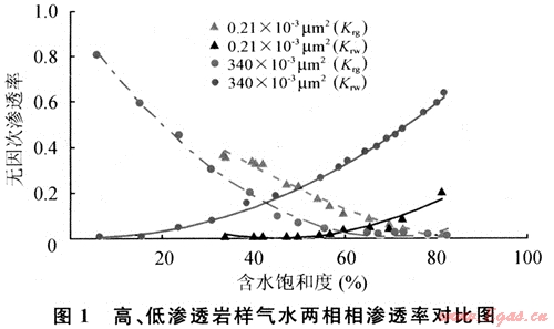 實驗表明,較之于中高滲透巖心而言,低滲透巖樣氣相、水相最大相對滲透率值較小。氣、水共滲區(qū)域較窄,隨含水飽和度升高,水相相對滲透率上升緩慢,水相形成連續(xù)流動,而氣相無因次滲透率迅速下降接近于0,出現(xiàn)所謂的“水鎖”現(xiàn)象[3](圖1)。Muskat等人[5]建立的兩相滲流運動方程成立的前提是相對滲透率僅是含水飽和度的函數(shù),而不受壓力、流速以及界面阻力的影響。即