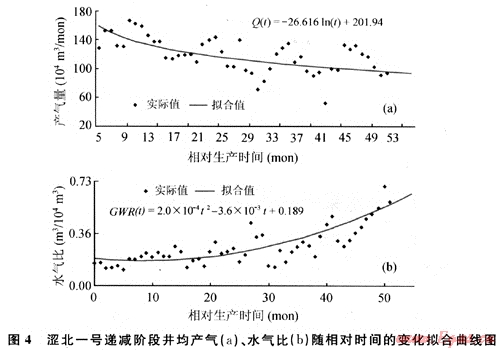 對澀北一號氣田遞減階段的井均日產(chǎn)氣量、氣水比隨相對生產(chǎn)時間的變化關(guān)系進行回歸,得到如下關(guān)系式(圖4)。