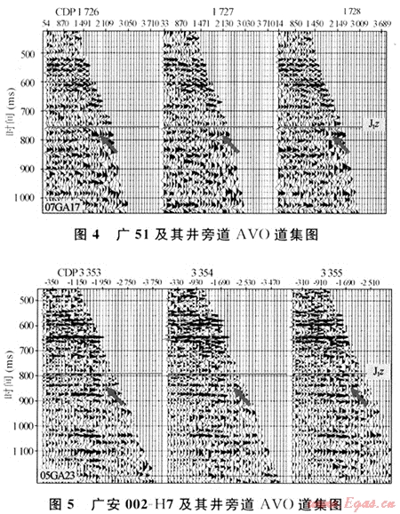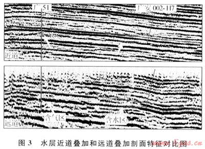 圖3是過廣51(工業(yè)氣井)和廣安002-H7(水井)的一條近道和遠(yuǎn)道疊加剖面對(duì)比圖,從圖中看出,須六段氣層底的反射在遠(yuǎn)道疊加剖面上的振幅明顯比近道疊加剖面振幅強(qiáng),近道疊加剖面主要表現(xiàn)為中-中弱振幅、較連續(xù),而遠(yuǎn)道振幅較強(qiáng),但橫向上振幅強(qiáng)弱變化明顯,有時(shí)呈低頻、復(fù)波特征;反射軸時(shí)常出現(xiàn)上下起伏、零亂等反射特征。水層在近道疊加剖面和遠(yuǎn)道疊加剖面上反射振幅都較強(qiáng),同相軸較光滑,呈高頻、連續(xù)特征,遠(yuǎn)道疊加剖面的反射振幅比近道略有增強(qiáng),但與氣層相比,不明顯。