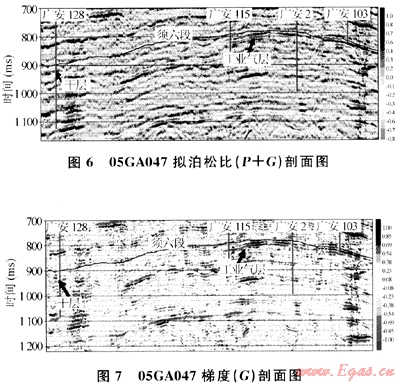 通過實(shí)際資料的AVO屬性剖面反演與鉆井結(jié)果的綜合分析對(duì)比,認(rèn)識(shí)到在上述5種AVO屬性剖面中,擬泊松比剖面(P+G)和梯度剖面(G)能很好地指示須六段儲(chǔ)層的含氣性,含氣處都表現(xiàn)為強(qiáng)振幅,且反演結(jié)果與實(shí)際鉆井結(jié)果非常吻合(見圖6、7),該方法是AVO疊前道集分析和近遠(yuǎn)道疊加剖面對(duì)比氣層預(yù)測(cè)方法的有效補(bǔ)充,可以進(jìn)一步提高須六段氣層的預(yù)測(cè)精度。