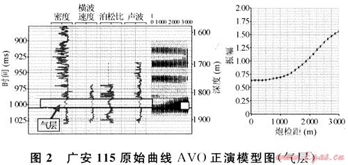 圖2為廣安115井原始曲線AVO正演模型,目的層為須六段1828~1840m、1843~1953.5m為工業(yè)氣層,左圖分別是測(cè)井實(shí)測(cè)的密度、橫波速度、泊松比和聲波4條曲線和采用Zoepprittz方程計(jì)算出的中心點(diǎn)道集,右圖中虛線是合成道集上拾取的反射振幅隨炮檢距的變化關(guān)系,從圖中可以看出,須六段氣層的AVO響應(yīng)特征非常明顯,在共中心點(diǎn)道集上氣層的反射振幅隨炮檢距的增大明顯增強(qiáng)。