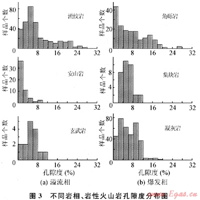 火山巖儲(chǔ)層形成受多因素的控制?;鹕綆r相控制了儲(chǔ)層原生孔隙和原生裂縫,是好儲(chǔ)層形成的基礎(chǔ),爆發(fā)相為火山巖相最有利的相帶。對(duì)979塊火山巖樣品的孔隙度進(jìn)行統(tǒng)計(jì)顯示:爆發(fā)相優(yōu)于溢流相;爆發(fā)相中角礫巖的物性最好,凝灰?guī)r次之(圖3)。