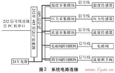 電路設(shè)計要根據(jù)測試系統(tǒng)中所選用的儀器儀表來進行。溫度測量采用德國原產(chǎn)溫度傳感器與變送器,Pt100精度等級1/3B,4線制;溫度測量范圍為0~150℃,具有響應(yīng)時間短、測量精度高等特點,輸出信號4~20mA。流量測量采用德國原產(chǎn)ProcessMaster系列電磁流量計、五點標定后精度為0.2%。電磁流量計根據(jù)法拉第電磁感應(yīng)定律設(shè)計,流量正比于介質(zhì)流速和磁通密度,以及電極間的距離。電壓信號用變送器轉(zhuǎn)換成標準信號,方便數(shù)據(jù)采集,而且電磁流量計無節(jié)流部件,壓力損失小,減少能耗,只與被測流體的平均速度有關(guān),測量范圍寬。只需經(jīng)水標定后即可測量其他介質(zhì),無須修正,相比于浮子流量計精度大大提高。壓力測量采用德國原產(chǎn)壓力傳感器,測壓范圍為0~3MPa,精度為0.15%,輸出標準電流信號。燃氣消耗量測量采用日本品川濕式氣體流量計,既可以通過流量計的機械表盤讀取燃氣消耗量,也可以通過其發(fā)出的電信號經(jīng)過處理后得到燃氣消耗量。燃氣壓力測量用壓力表量程為0~5kPa,輸出相應(yīng)的電信號進行數(shù)據(jù)采集。流量調(diào)節(jié)閥選用電動調(diào)節(jié)閥,進行遠程控制。煙氣分析儀采用多組分煙氣分析儀,各組分都有對應(yīng)的電信號輸出。數(shù)據(jù)采集模塊選用ADAM系列模塊對各參數(shù)進行高精度采集與控制。系統(tǒng)電路連接見圖2。