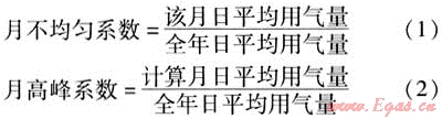 燃?xì)庥脩羧曛懈髟碌挠脷獠痪鶆蚯闆r用月不均勻系數(shù)來表示,逐月日平均用氣量出現(xiàn)最大值的月份稱為計(jì)算月,月不均勻系數(shù)最大值稱為月高峰系數(shù)。月不均勻系數(shù)和月高峰系數(shù)的計(jì)算公式為: