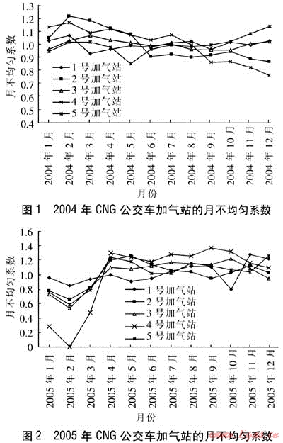 根據(jù)采集到的5座CNG公交車加氣站的加氣量數(shù)據(jù),按式(1)計(jì)算得到各站2004年、2005年的月不均勻系數(shù),見圖1、2。