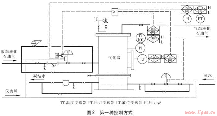 氣化器的控制方式比較靈活,實際生產(chǎn)中往往要根據(jù)現(xiàn)場的工況、氣化量、用途及性價比等因素綜合考慮,總之,系統(tǒng)要具有較強(qiáng)的抗干擾能力,應(yīng)易于擴(kuò)展,對于安全性要求較高的場合應(yīng)本著滿足故障安全的設(shè)計原則。本文討論2種控制方式,分別見圖2和圖3。圖3的圖例同圖2。