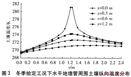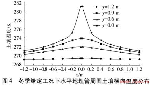 由圖4可知,土壤溫度沿橫軸方向成完全對稱的單峰狀分布,經(jīng)分析可得到如下結(jié)論:①從地埋管所在位置x=0沿橫向向兩側(cè)遠離地埋管,土壤溫度逐漸降低。在y=0.6、0.9、1.2m的3條橫軸上,溫度曲線存在以戈=0為中心向兩側(cè)下降的趨勢,即土壤溫度在x=0處溫度最高,向兩側(cè)降低。同樣在y=1.2m這條橫軸上,溫度分布不連續(xù),在管外壁最左端x=-0.0145m與最右端x=0.0145m之間間斷,這是水平地埋管位置所在。②4條曲線的變化幅度不同,y=1.2m橫軸上的土壤溫度變化最大,y=0橫軸上的溫度變化最小。這說明隨著位置