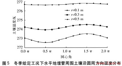 由圖5可知:①土壤溫度沿圓周方向呈正弦曲線分布,每個圓周上溫度最高點(曲線波峰)都是出現(xiàn)在原平面的1.5π方向,即圓周最底端;溫度最低點(曲線波谷)出現(xiàn)在原平面的0.5π方向,即圓周最頂端。②圓周方向上的土壤溫度呈正弦曲線分布,但每個圓周上的土壤平均溫度不同,即土壤溫度沿3條正弦曲線都在自己的中心線附近變化。這是由于隨著圓周遠離地埋管,土壤溫度逐漸降低,r=0.1m圓周上的土壤平均溫度要高于r=0.3、0.5m圓周上的土壤平均溫度。③圓周方向上的土壤溫度呈正弦曲線分布,但每個圓周上的土壤溫度變化幅度各不相同,即溫度曲線的振幅不同。r=0.1m的曲線振幅最小,r=0.5m的曲線振幅最大,即距地埋管中心越近的圓周,其上土壤溫度變化程度越小;距地埋管中心越遠的圓周,其上土壤溫度變化程度越大。這是由于地埋管上方的土壤隨著位置越遠離地埋管越易受到大氣低溫的影響,因此地埋管上方的土壤隨著位置遠離地埋管,溫度逐漸降低,而且這種降低的速度越來越快。而地埋管下方的土壤隨著位置越遠離地埋管受大氣低溫的影響越小,這部分土壤由于遠離地埋管溫度也逐漸降低。但由于深度加大受大氣低溫影響減小,這種降低的速度卻是越來越慢的。這就導(dǎo)致在距地埋管距離越遠的圓周上,土壤溫度差距越大,即同一圓周上土壤的溫度變化越劇烈,變化的范圍越大。