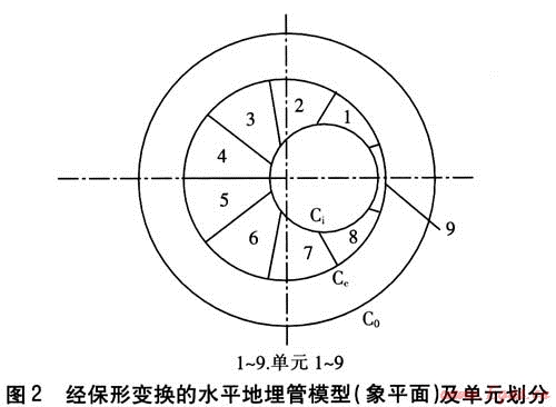 以水平地埋管換熱器土壤源熱泵為研究對象,建立水平地埋管的二維數(shù)學(xué)模型,該模型屬于圓柱理論模型。水平地埋管模型(原平面)及測點布置見圖1。采用邊界離散法對水平地埋管換熱器的熱力狀況進行分析,通過保形變換(見圖2)、分離變量及區(qū)域銜接得到了溫度場的級數(shù)解。在確定級數(shù)各項系數(shù)時,對于正交部分,采用傳統(tǒng)的Fourier方法;對于非正交部分,采取積分邊界元的方法[3~5]。模型軟件采用VB編制,計算水平地埋管及其周圍壤溫度場、熱流量分布、單位管長換熱量。