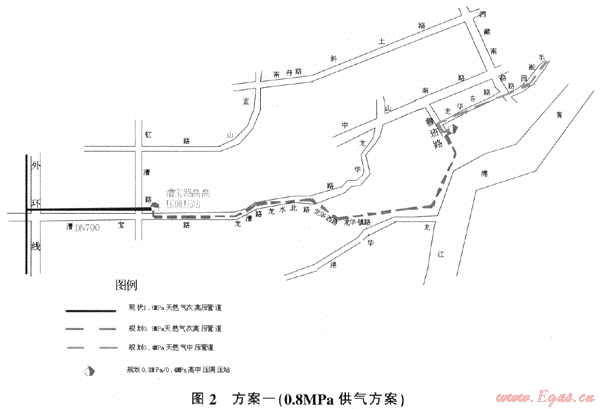 經(jīng)過(guò)與市規(guī)劃部門(mén)的征詢(xún),認(rèn)為該方案中初步確定的高壓站站址(龍華東路、魯班路口)無(wú)法實(shí)施,由于沒(méi)有管位,0.8MPa次高壓管道無(wú)法敷設(shè)到魯班路。
