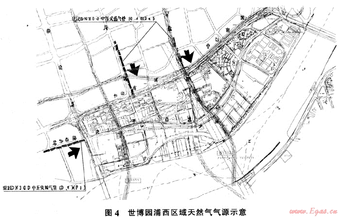 浦西世博園區(qū)天然氣氣源,由于受消防安全間距、管位、調(diào)壓站建設(shè)用地等條件的限制,規(guī)劃自漕寶路高中壓調(diào)壓站,延伸0.4MPa中壓管道至宜山路、斜土路,再?gòu)拿勺月?、局門(mén)路、制造局路、西藏南路、保屯路以及南車(chē)站路路口接出,向園區(qū)的用戶(hù)供應(yīng)天然氣。