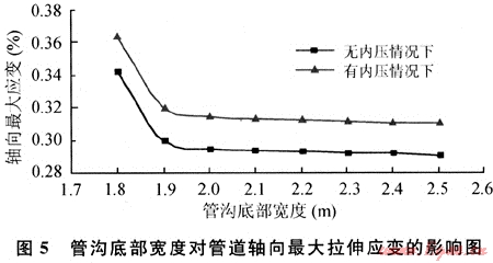 依據(jù)GB 50251—2003《輸氣管道工程設(shè)計(jì)規(guī)范》[8],深度在5m以?xún)?nèi)時(shí),溝底寬度應(yīng)按下式確定:B=D+K,其中B為溝底寬度,m;D為管子外徑,m,該算例取1.219m;K為溝底加寬裕量,m,一般不少于0.5m。所以該算例中管溝底部寬度B≥1.719m(1.219m+0.5m),因此管溝底部寬度的最小值取1.8m。改變管溝底部寬度,計(jì)算得到的管道軸向最大拉伸應(yīng)變值如圖5所示。結(jié)果表明:隨著管溝底部寬度的增大,管道所受的軸向最大拉伸應(yīng)變減小,而且在從1.8m增加到1.9m時(shí)發(fā)生突變。由此可見(jiàn)管溝底部寬度取1.9m時(shí)比較經(jīng)濟(jì),再寬挖的意義不大。