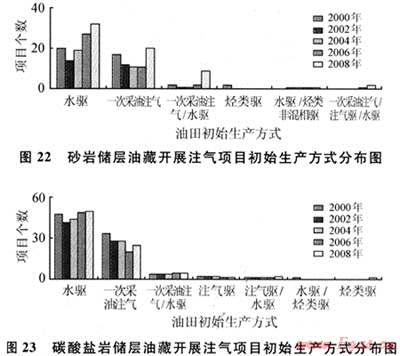我國大部分油田仍以傳統(tǒng)的注水方式進(jìn)行開發(fā),這些油藏能否注氣一直是關(guān)心的問題。從圖22、23中可以看出:近10a來,世界范圍內(nèi)無論是砂巖還是碳酸鹽巖油藏注氣項(xiàng)目,采用先注水后注氣的項(xiàng)目比進(jìn)行一次注氣的項(xiàng)目多,因此,無論是新油田的開發(fā)還是老油田二次開發(fā),注氣均被認(rèn)為是一項(xiàng)行之有效的提高采收率技術(shù)。