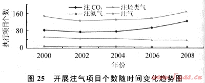 目前,我國CO2排放量居世界第二位,并且還在增長[13]。預(yù)測表明,到2025年,我國CO2排放總量很可能超過美國,居世界第一位。由圖25可以看出:近10a來,世界注氣特別是注CO。提高采收率技術(shù)(EOR)項(xiàng)目逐年增加,已成為世界范圍內(nèi)提高原油產(chǎn)量的重要手段之一。CO2在幾種氣體中混相壓力最低,效果最好,氣源最豐富,發(fā)展注CO2驅(qū)油將是我國的方向。