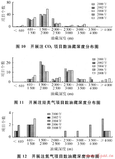 從理論上分析,CO2驅(qū)需要的混相壓力最低,所以實(shí)現(xiàn)混相的深度最淺,采用CO2驅(qū)的油藏深度主要分布在610~2000m(圖10),而且主要是混相驅(qū);烴類氣驅(qū)混相壓力相對(duì)較高,油藏深度主要是1500~2000m及2500~3000m(圖11);氮?dú)怛?qū)所要求的混相壓力最高,但許多油藏都應(yīng)用了重力驅(qū),因此不需混相,目前實(shí)施的項(xiàng)目油藏深度在610~1500m范圍(圖12)。