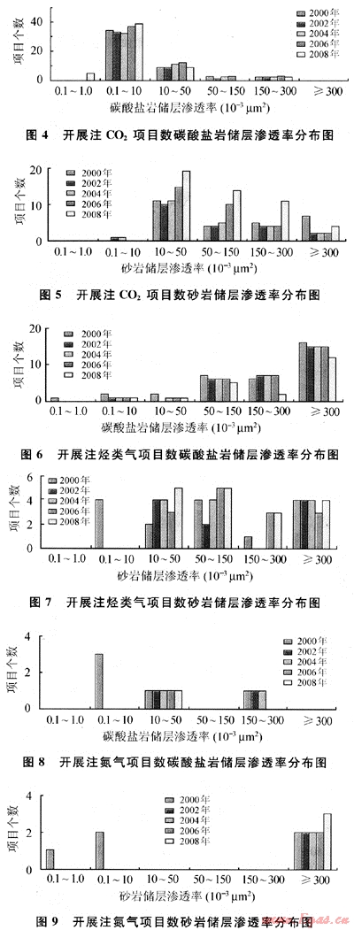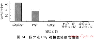 隨著全球?qū)O2排放引起大氣污染的日益重視,注CO2資源化利用潛力越來越大,其項(xiàng)目占了絕大部分。在我國開展了很多注CO2的吞吐項(xiàng)目,部分CO2驅(qū)也在實(shí)施。國家也很重視CO2排放及資源利用,專門批準(zhǔn)“973”項(xiàng)目“溫室氣體提高石油采收率的資源化利用及地下埋存”,還設(shè)置了國家重大專項(xiàng)和“863”重點(diǎn)項(xiàng)目,對(duì)CO2埋存及資源化利用的各個(gè)方面進(jìn)行了全面研究。但我國目前大多數(shù)項(xiàng)目都未實(shí)現(xiàn)CO2混相驅(qū)。對(duì)國外2008~2009年注CO2混相驅(qū)的108個(gè)項(xiàng)目進(jìn)行統(tǒng)計(jì),表明國外注CO2混相驅(qū)原油黏度主要分布在0.8~1.2mPa·s,溫度主要分布在30~60℃,儲(chǔ)層深度在600~2000m的較多,碳酸鹽巖注氣滲透率主要在(0.1~10)×10-3μm2及(10~50)×10-3μm2范圍內(nèi),砂巖中注CO2是滲透率大于10×10-3μm2的油藏??梢妵庵饕菍?duì)碳酸鹽巖油藏進(jìn)行混相驅(qū)(圖24)。當(dāng)然其原油組成對(duì)混相壓力影響也較大,但由于沒有公布的數(shù)據(jù),因此這里未列出[9~10]。