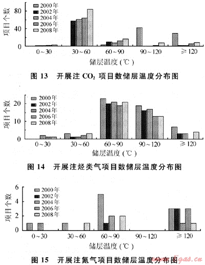 在CO2混相驅(qū)中,MMP隨油藏溫度的升高而增加[8],說明油藏溫度過高對(duì)注CO2混相驅(qū)油藏的開采不利。從圖13~15中可以得出,在成功進(jìn)行注CO2項(xiàng)目中,選擇溫度分布在30~60℃的油藏最多;進(jìn)行注烴類氣的項(xiàng)目中,選擇溫度分布在60~120℃的油藏最多;注氮?dú)獾捻?xiàng)目中,選擇溫度分布在60~90℃和大于120℃的油藏最多。