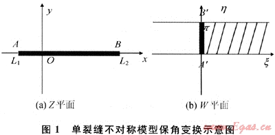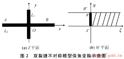 如圖1所示,采用保角變換函數(shù)將Z平面上建立的x-y不對稱裂縫坐標系轉化為W平面車ε-η坐標系,可用于描述儲層不對稱裂縫的流動形態(tài)對壓裂后產(chǎn)能的貢獻。