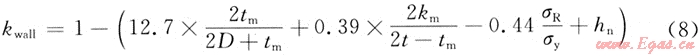 套管的抗內(nèi)壓強度與壁厚的允許誤差因子(kwall)有關(guān)。套管的磨損大多為月牙形磨損,與磨損對套管抗擠強度的影響分析相同,考慮套管的內(nèi)壁不圓度、壁厚不均度和殘余應(yīng)力的影響,則可將允許誤差因子與包含套管內(nèi)壁不圓度、壁厚不均度和殘余應(yīng)力的綜合影響系數(shù)(Hult)等效。允許誤差因子為: