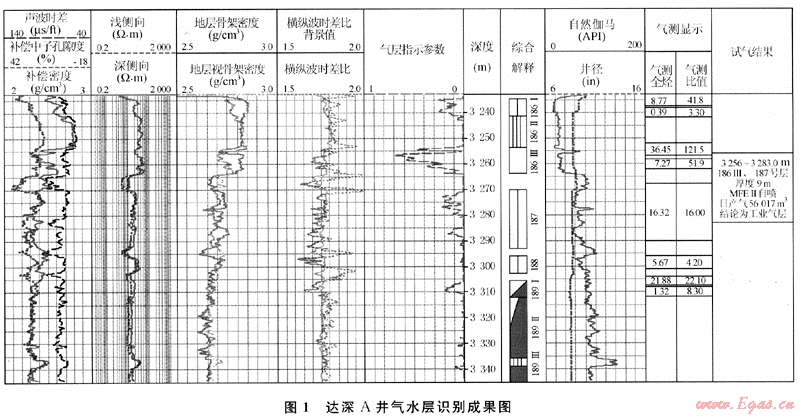 中基性火山巖儲層氣水層識別是一項較為困難的工作,僅靠單一識別方法在實際工作中存在一定的局限性。為避免在測井解釋中出現(xiàn)的氣層誤判、漏判現(xiàn)象,綜合以上3種方法,應用綜合概率法,制定了一個氣層指示參數(shù),氣層指示參數(shù)越大,表明該井段含氣性更好。如圖1達深A井氣層指示參數(shù)曲線最高的186Ⅲ號層,其對應的錄井氣測比值也是最高的,氣測比值達到121.5;而氣層指示參數(shù)曲線為零或為不連續(xù)的零星小段處,錄井均未見氣測顯示,綜合解釋為干層或水層,說明氣層指示參數(shù)曲線與含氣性一致性較好。