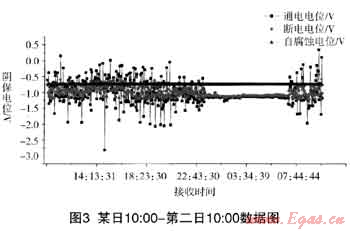 比較通電電位、斷電電位及自然腐蝕電位可見,在干擾嚴重時間段,通電電位變化幅度大于斷電電位變化幅度,這是由于通電電位中包含雜散電流造成的IR降的影響,變化幅度從理論上要大于斷電電位。由于自然電位的試片不與管道電連接,因此,其不受管道中流入流出雜散電流的干擾,電位穩(wěn)定。有了自然電位,不僅可以用-850mV CuS04極化電位準則判定,而且可以利用1OOmV極化偏移準則對保護效果進行判斷陰極保護效果。通過以上各個不同時期的數(shù)據(jù)分析可以看到,無線遠程傳輸系統(tǒng)可以比較穩(wěn)定的監(jiān)測1天24h之內(nèi)的自然電位、通電電位和斷電電位的變化,對管線安全穩(wěn)定運行提供了科學的管理依據(jù)。