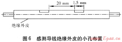 感測導(dǎo)線的絕緣外皮有規(guī)則的孔(見圖6),小孔可以感知保溫層濕度的變化??椎拈g隔為20mm,每個(gè)小孔的寬度為1.5mm。漏點(diǎn)檢測系統(tǒng)要求感測導(dǎo)線、反饋導(dǎo)線與管道之間的阻抗以及兩導(dǎo)線之間的絕緣電阻必須大于等于50MΩ。