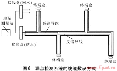 漏點(diǎn)檢測系統(tǒng)線纜敷設(shè)必須遵循以下原則:只有感測導(dǎo)線敷設(shè)至分支管,反饋導(dǎo)線不敷設(shè)到分支管。漏點(diǎn)檢測系統(tǒng)的線纜敷設(shè)方式見圖8,圖8僅為供水管道的線纜敷設(shè)方式,回水管道需另外敷設(shè)線纜。