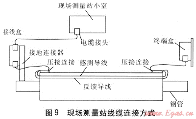 現(xiàn)場測量站線纜連接方式見圖9。主要連接裝置有:現(xiàn)場測量站小室內(nèi)安裝漏點(diǎn)檢測模塊、通信模塊等;現(xiàn)場測量站小室與接線盒之間的連接電纜;帶有接地連接器的接線盒;用于連接感測導(dǎo)線與反饋導(dǎo)線的終端盒等?,F(xiàn)場測量小室、接線盒、終端盒、連接電纜的防護(hù)等級均為IP65。