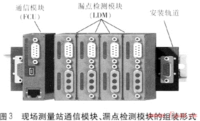 現(xiàn)場測量站通信模塊、漏點(diǎn)檢測模塊的組裝形式見圖3,所有模塊均安裝在軌道底板上,結(jié)構(gòu)簡單,安裝方便。漏點(diǎn)檢測模塊的作用是:測量管道與傳感器導(dǎo)線之間的阻抗;通過傳感器導(dǎo)線與其他漏點(diǎn)檢測模塊通信(采用管段兩端測量時(shí));支持不同管段通信模塊間的數(shù)據(jù)傳輸;當(dāng)有泄漏發(fā)生時(shí),發(fā)出報(bào)警信號(hào)。