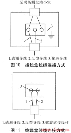 每一段檢測管段安裝一個(gè)接線盒,接線盒安裝在接地連接器上,接地導(dǎo)線與接地連接器連接,接地連接器焊接在管道上做到接地良好。接線盒經(jīng)連接電纜與現(xiàn)場測量站小室相連,接線盒線纜連接方式見圖10。在管段的末端安裝終端盒,將感測導(dǎo)線與反饋導(dǎo)線相連,終端盒線纜連接方式見圖11。