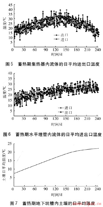 蓄熱期集熱器內(nèi)流體的日平均進(jìn)出口溫度、水平埋管內(nèi)流體的日平均進(jìn)出口溫度、地下坑槽內(nèi)土壤的日平均溫度見(jiàn)圖5~7。