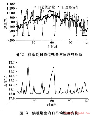 由圖11~13可知,地板輻射供暖系統(tǒng)日平均供回水溫度為18~30℃,日平均供回水溫差為1~5℃。日總供熱量的變化趨勢(shì)基本與地板輻射供暖系統(tǒng)日平均進(jìn)出口溫度基本一致。整個(gè)供暖期,室溫均在18℃以上,滿足要求。