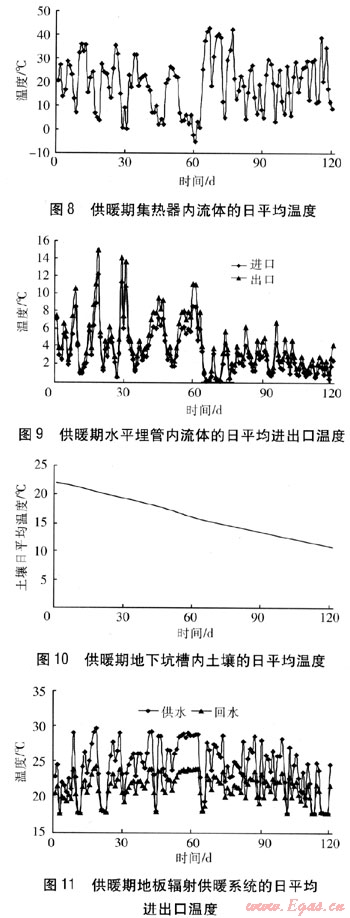 供暖期集熱器內(nèi)流體的H平均溫度、水平埋管內(nèi)流體的日平均進(jìn)出口溫度、地下坑槽內(nèi)土壤的日平均溫度、地板輻射供暖系統(tǒng)日平均進(jìn)出口溫度、日總供熱量與日總熱負(fù)荷、室內(nèi)日平均溫度見(jiàn)圖8~13。